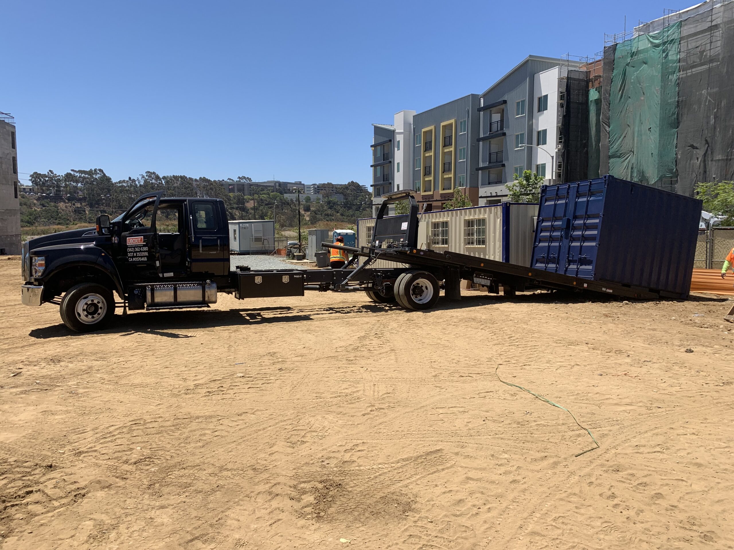 This truck is backed up to where you want the container placed; the bed is titled and the container is rolled off the back of the truck into position. This truck requires at least 60-feet of straight line clearance to safely complete this delivery. When placing your order, we will ask whether you want the container loaded with the doors facing the cab or the rear of the truck as this determines the final door placement at the site after delivery.